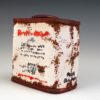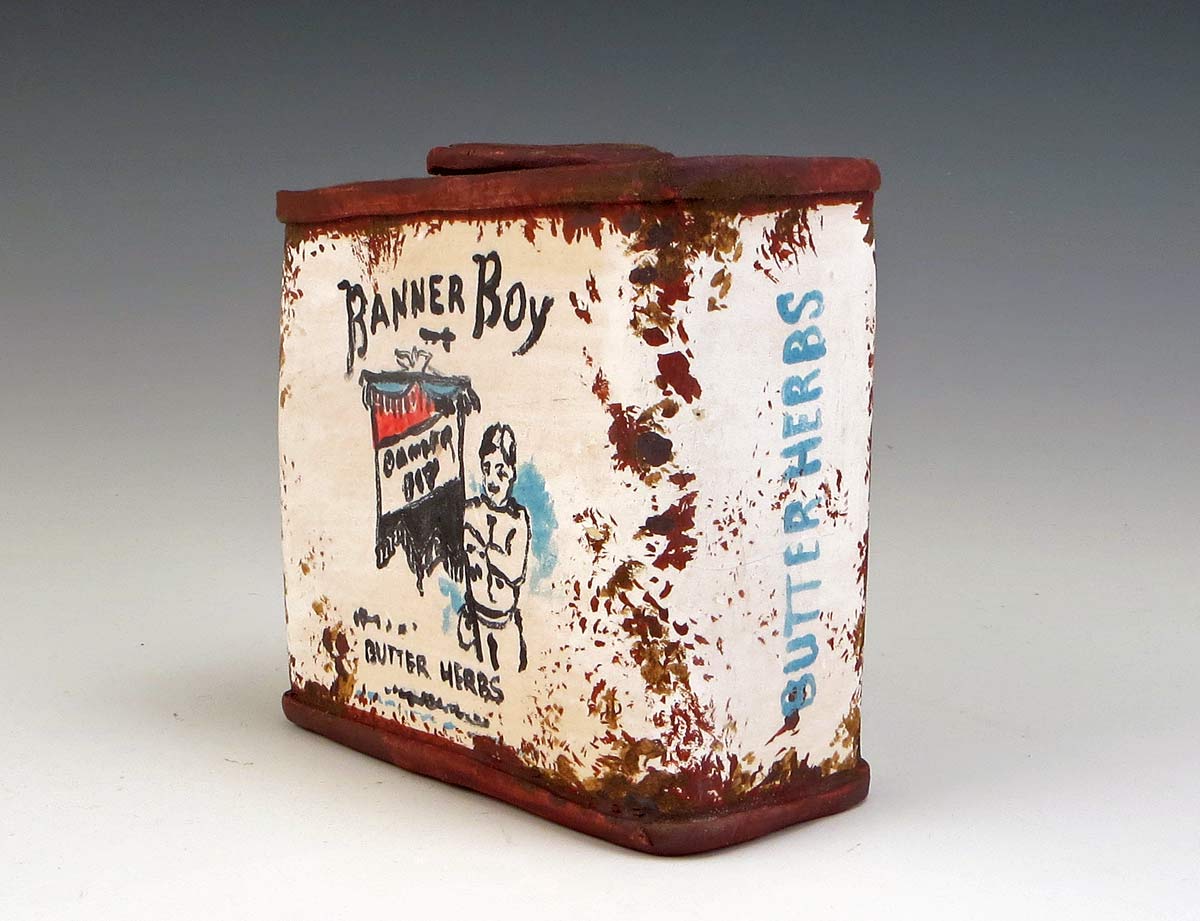 This ceramic spice tin explores the real vintage brand – Banner Boy – combined with some more modern contents: Butter Herbs! It is entirely hand-formed and painted with fired-on ceramic colors recalling old tins in both size and character with touches of rust and sometimes a dent. The lid is removable, which adds a nice bit of functionality. Go ahead and use it for YOUR special herb mix, or other treats and trinkets. Enjoy its fool-the-eye nature on a shelf, perhaps in a group of several. It makes a unique gift!