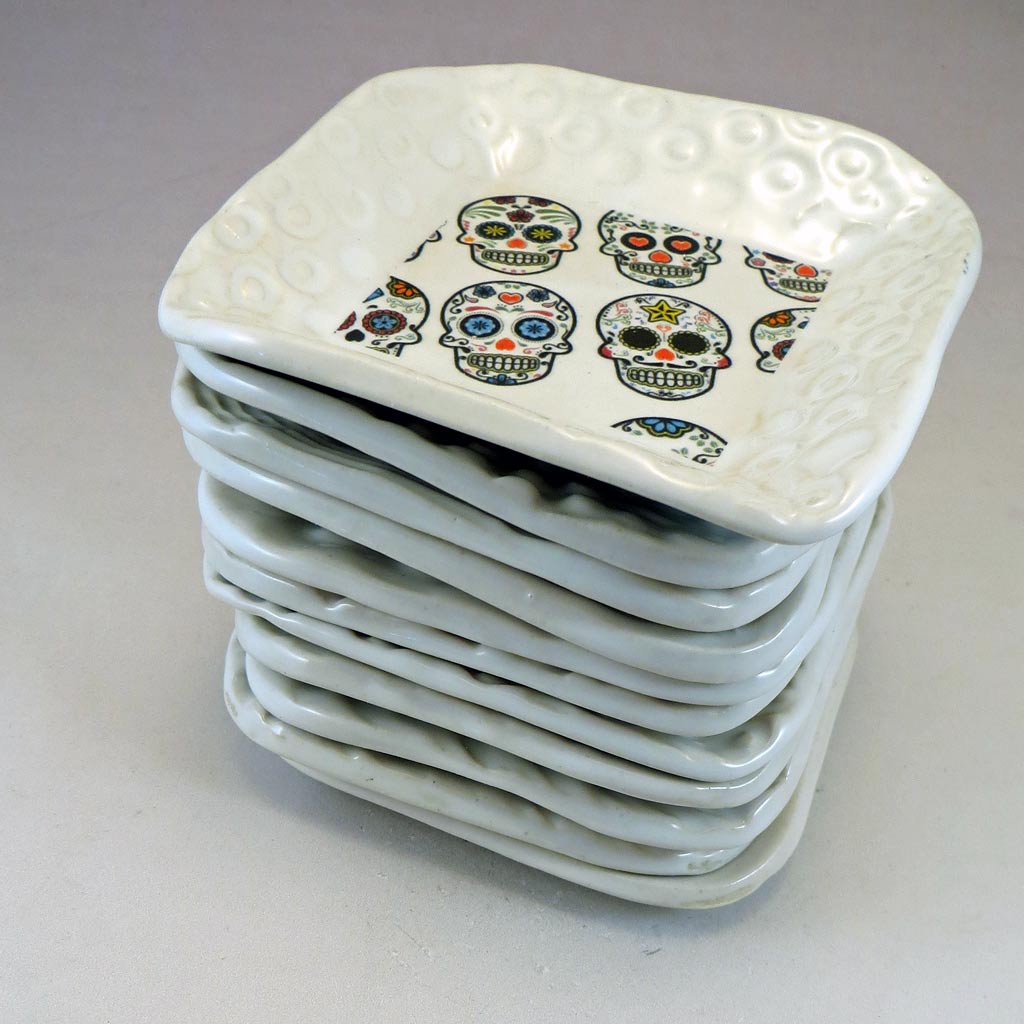 Here’s a group of small dishes in white with a “wallpaper” sugar skull decal in the center. One’s a handy size for catching small items or offering a dab of something yummy. The textured edges and the offset rows of colorful sugar skulls create a unique pattern for Days of the Dead ofrendas and more. Group a few of these skull dishes together, mixed and matched. Be sure to scan the listings for the other colors.